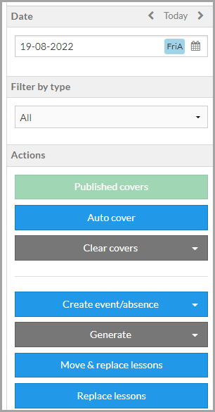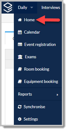 At the top of the ‘Options’ menu is the ‘Date’, which shows the calendar date for the selected day. Timetable Daily will automatically load on today’s date. However, if you prefer, you can click on the date cell and select a new date from the calendar selector or cycle through the days using the arrows < >. At any time you can return to today’s date using ‘Today’.