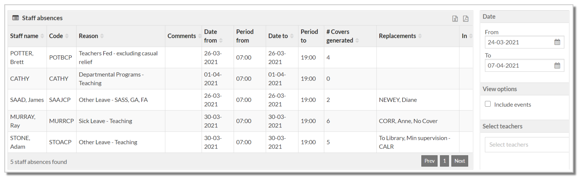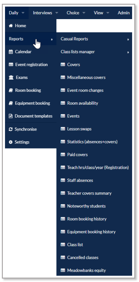 There are a variety of reports available for the Daily Organiser or Administrator to gather data on casual teachers, covers, events, absences, rooms, equipment and students. All reports can be found via Daily > Reports and all are exportable as PDF or csv formats. Filters are available to refine the data in each report including date range, teacher and cover type.