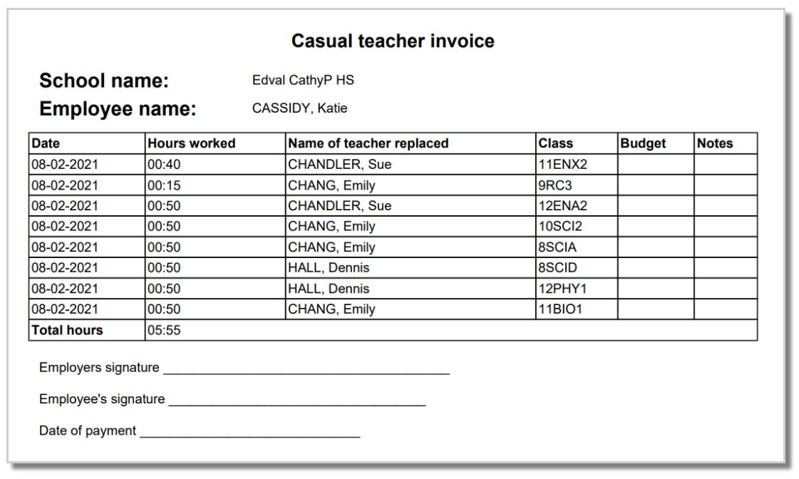 An invoice can be produced for any casual teacher over a selected date range. Here is an example of an invoice.