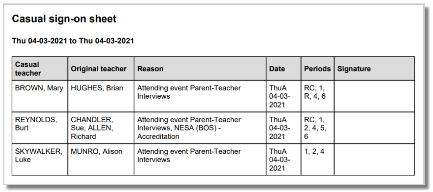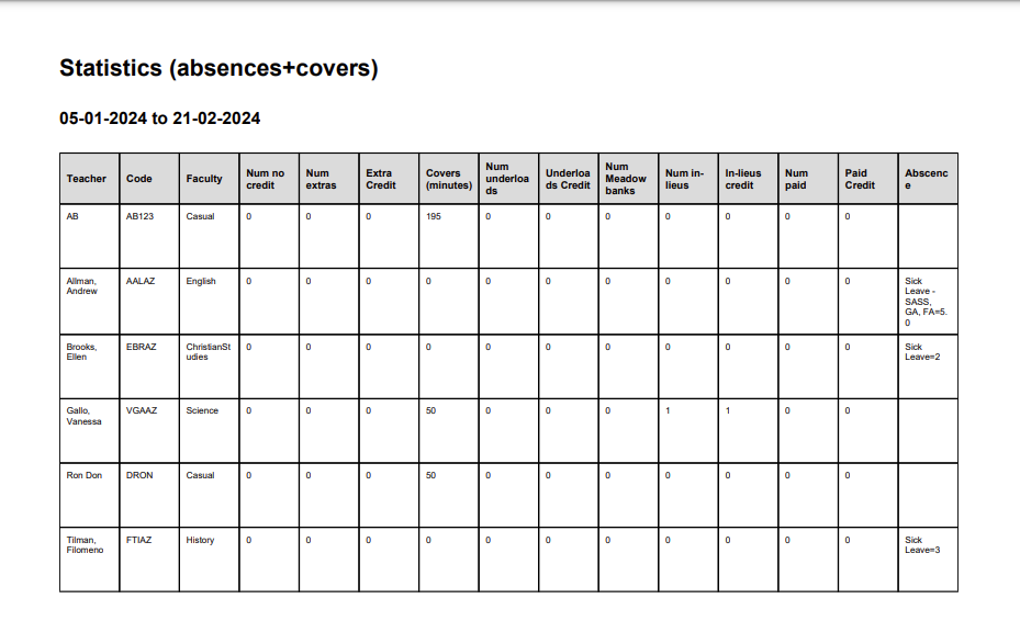 The report is designed to assist in the accounting for the use of casual staff. It can be run over any date range and shows which periods each casual teacher covered on each day.