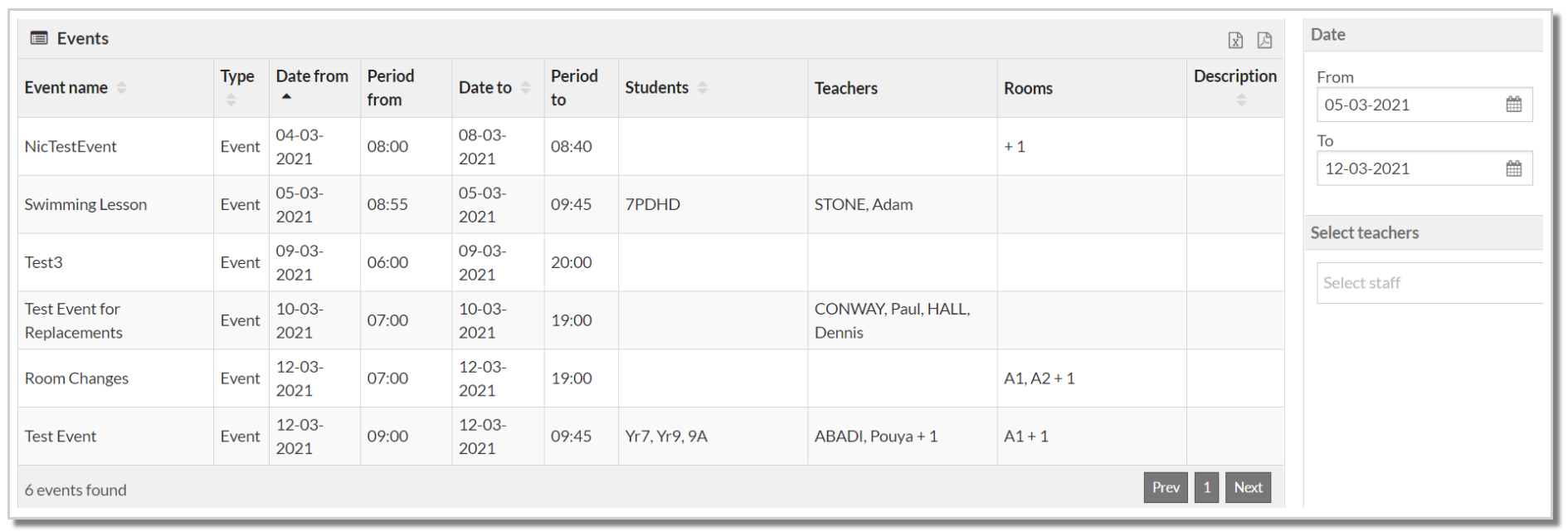 - The report will display the name of the event, the date of the event and the teachers on the event in the report header
