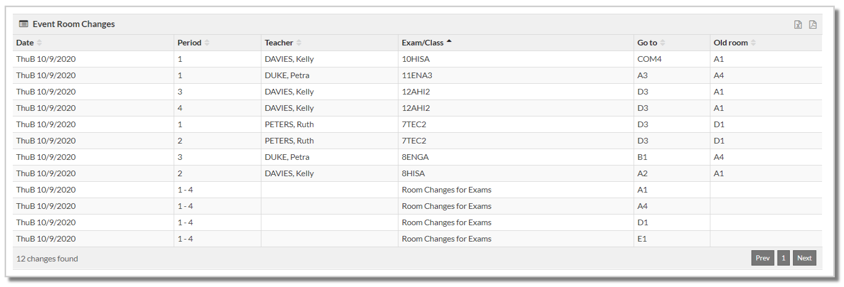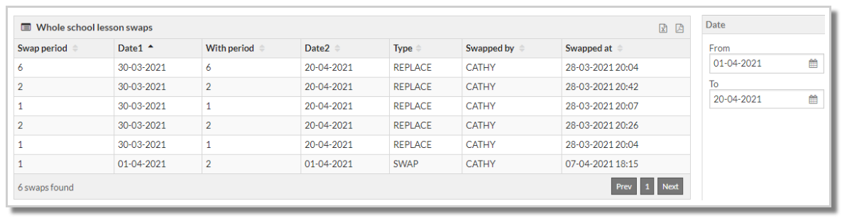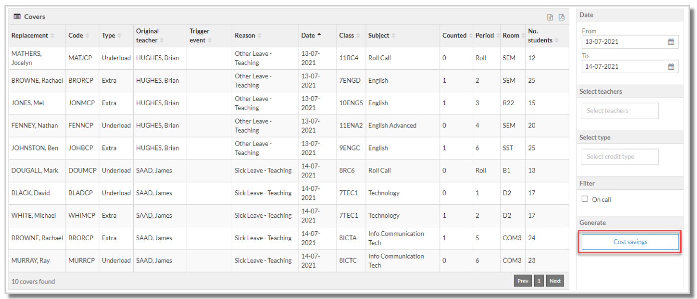 Data can be sorted by any column and can be filtered by Teacher or Type or by On-call covers. The addition of the room column provides an opportunity to use this report to communicate covers over multiple days.
