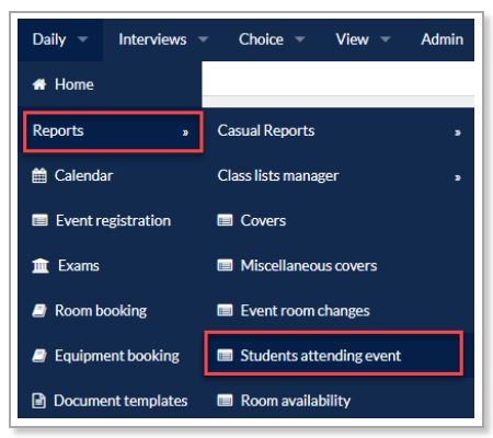To run this report go to Daily > Reports > Students attending event.