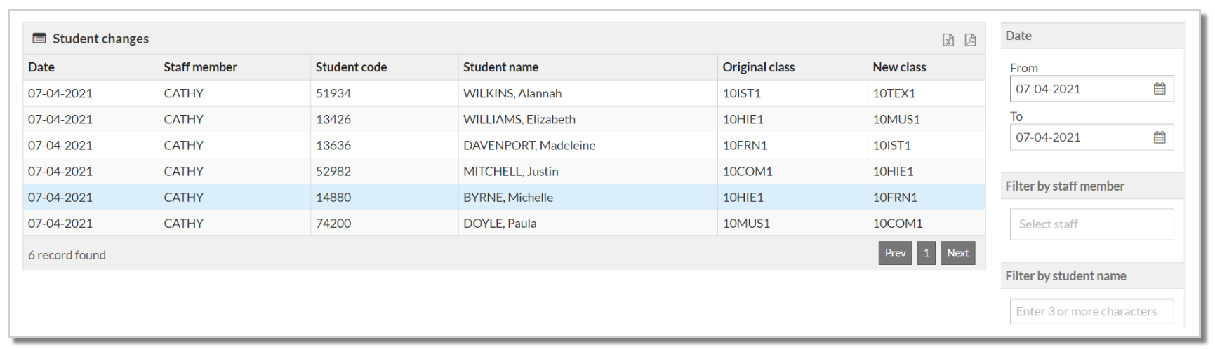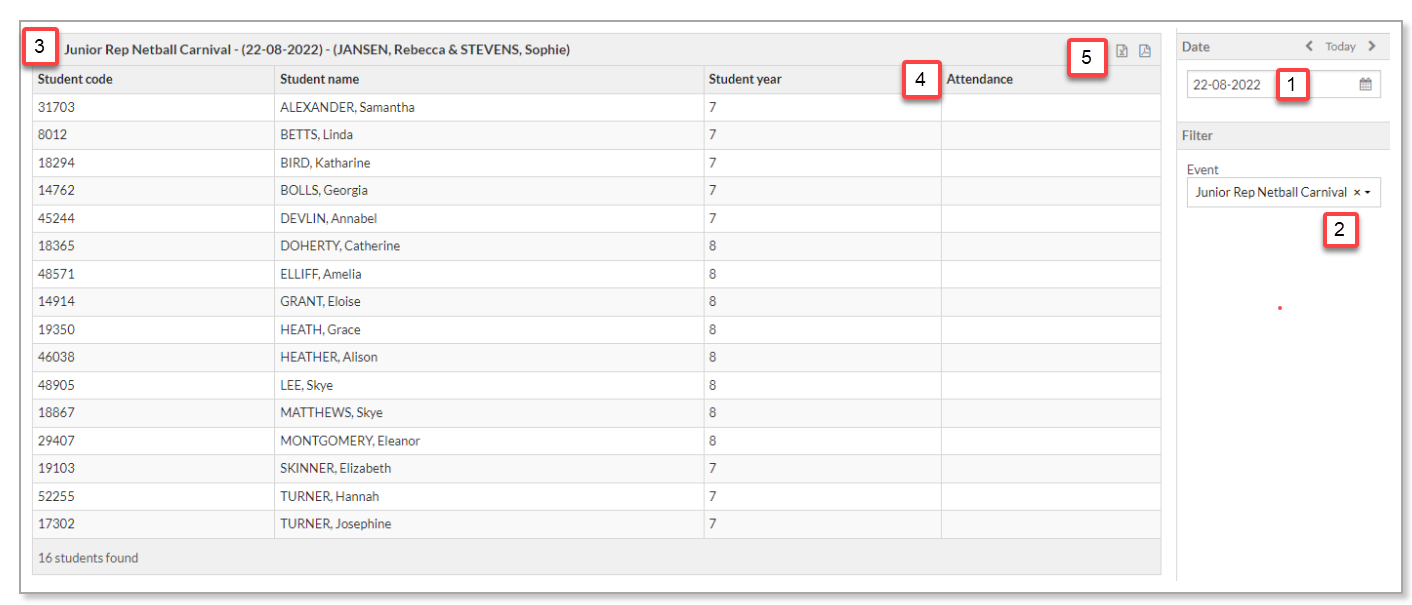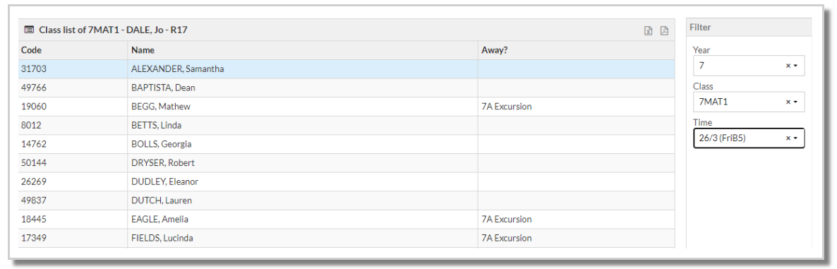 - The Attendance column will not be populated but is made available for manual roll marking on the printed report.