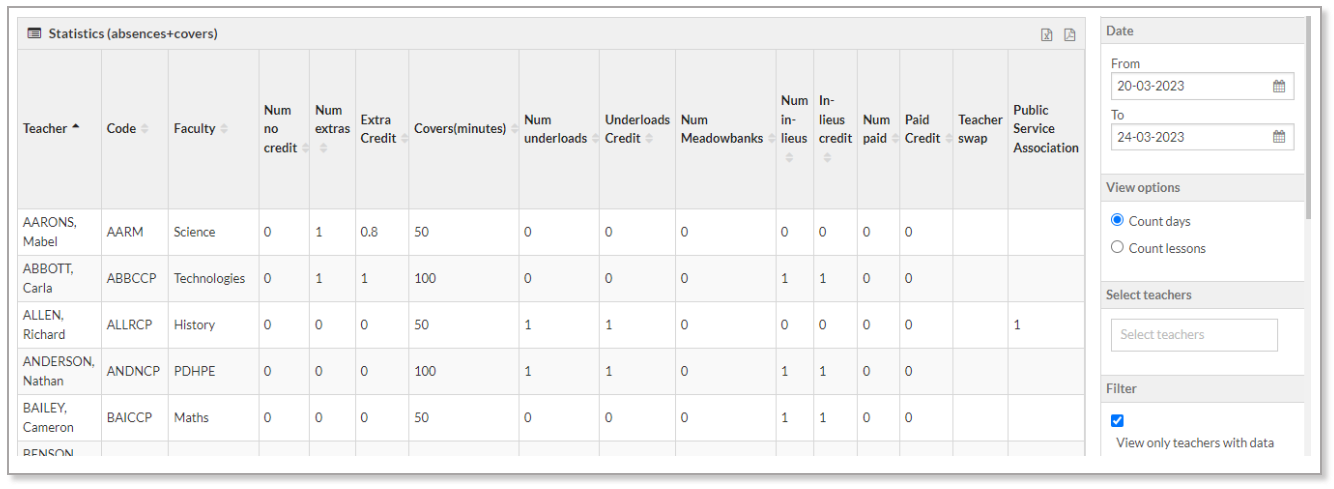 The filter 'View only teachers with data' when selected, will hide all teachers who have not had any paid covers over the selected date range.