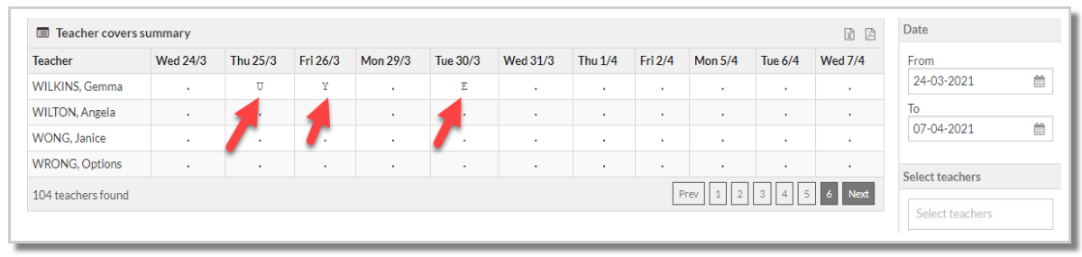 This report provides a summary of the number and type of covers for teachers over a selected date range. In the example below, Gemma Wilkins has been given an underload cover on 25/3, a Yard duty cover on 26/3 and an Extra on 30/3. The filter 'View only teachers with data' when selected, will hide all teachers who have not had any covers over the selected date range.