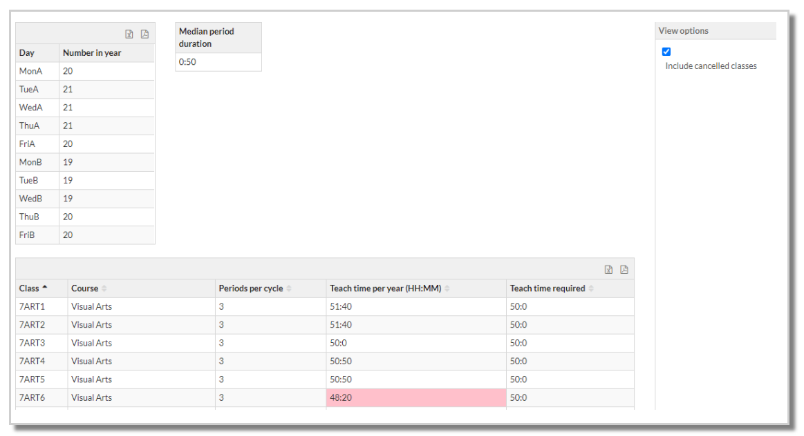 The first table shows the number of days each ‘cycle day’ occurs in the year. These calculations also manage instances of more complex ‘day swaps’ if users choose to run Mondays classes on a Tuesday following a public holiday for example.