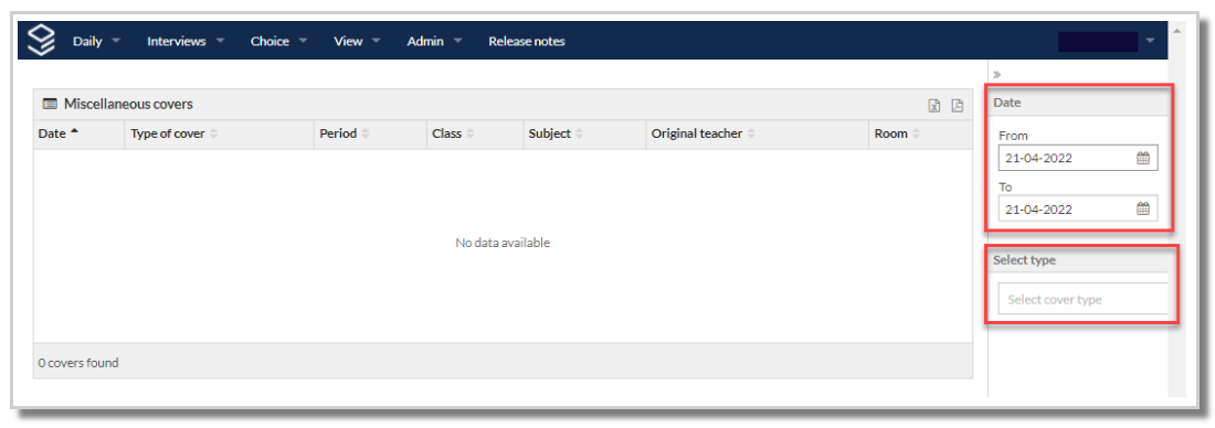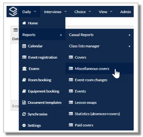 To generate the Miscellaneous covers report, navigate to Daily > Reports > Miscellaneous covers
