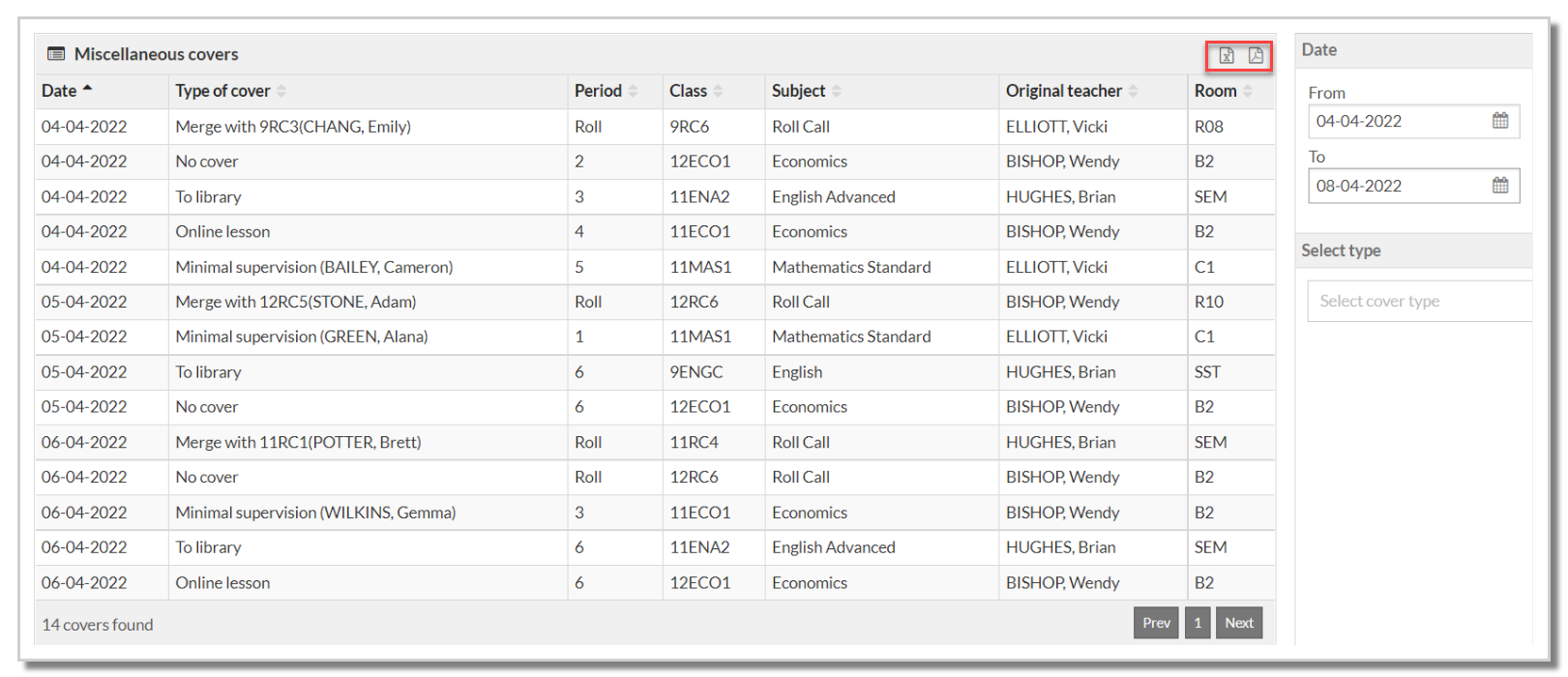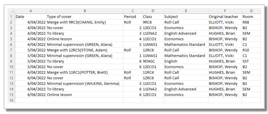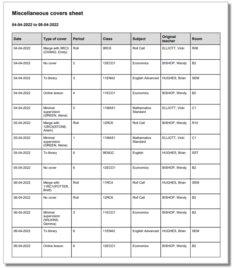 This report details the classes that have been covered using the cover options of Merge, Minimal supervision, No cover, Online lesson and Class to library over a specified date range.