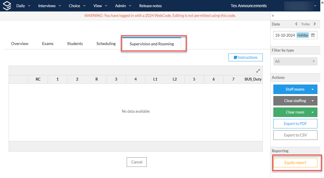 While you can export your exam events via Daily > Report > Events but if you need to export the Equity Report you would need to go the Daily > Exams, edit the exam and go to "Supervision and Rooming" screen, click on the "Equity report" at the right panel section and export.