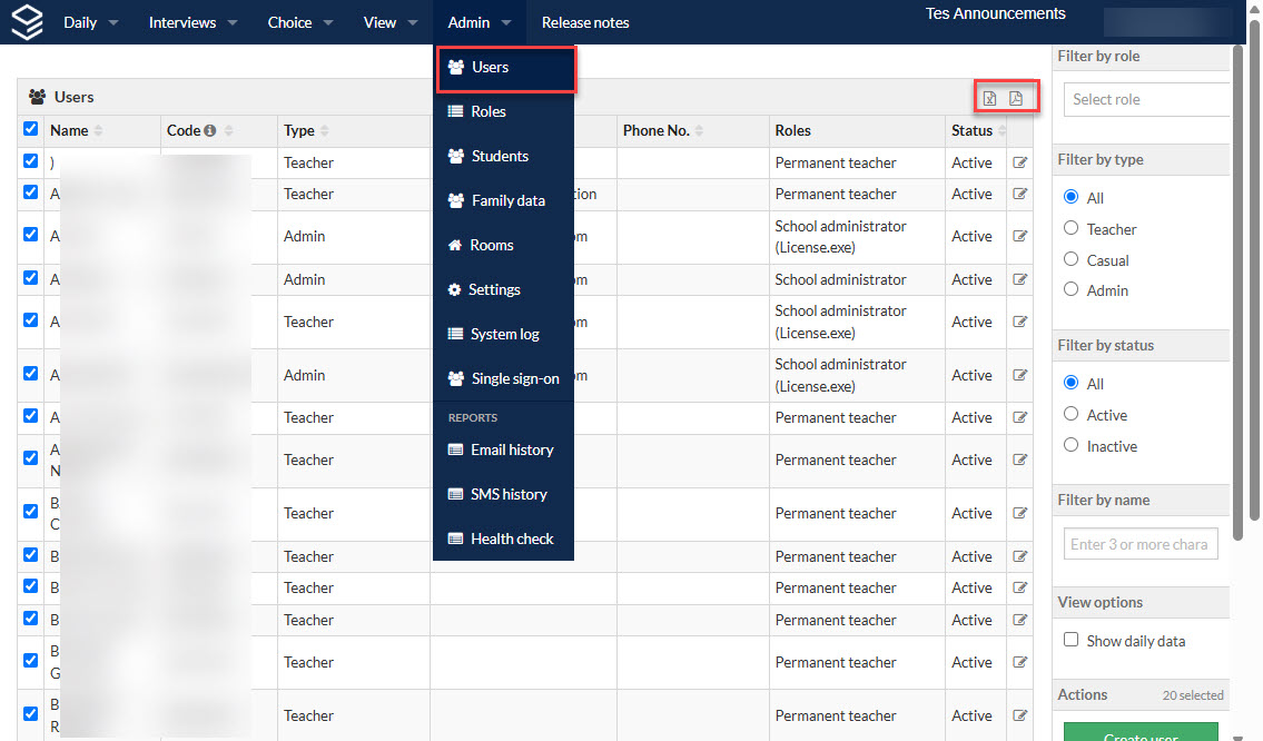 You can export the list of all your permanent teachers and casual/admin users, go to Admin> Users select all users and hit the excel/pdf export icon at the top right section of window. You can do the same export for the rest of your data under the Admin screen such as your students, family data, rooms.