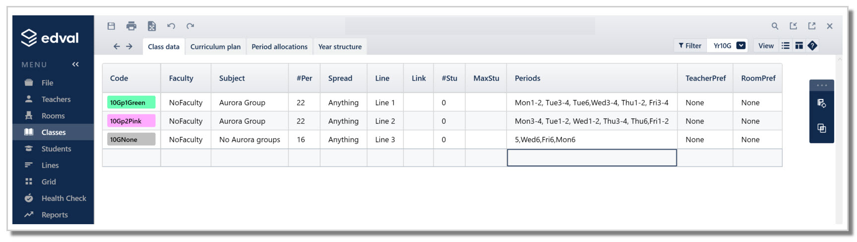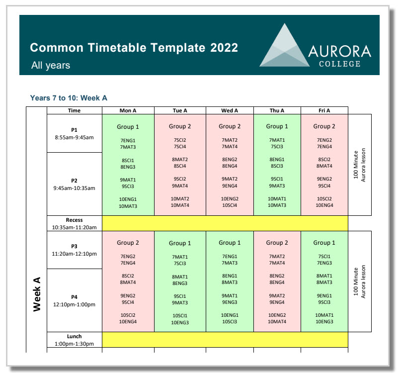 Each year Aurora College supply a template of the assignment of groups and classes to periods on their timetable.