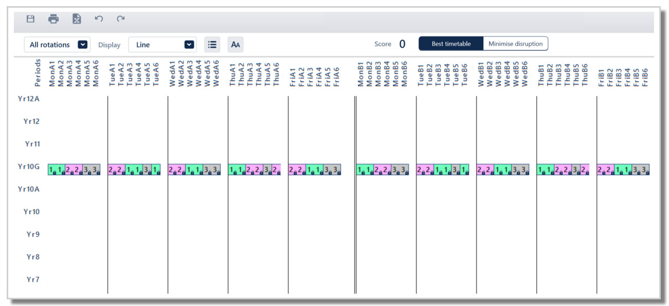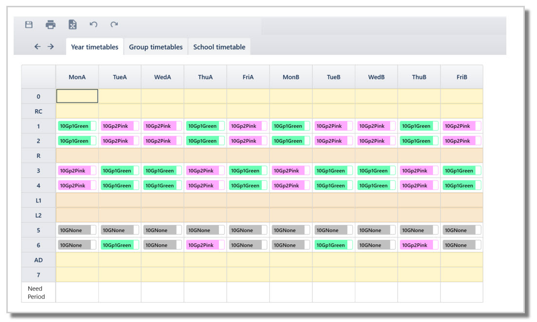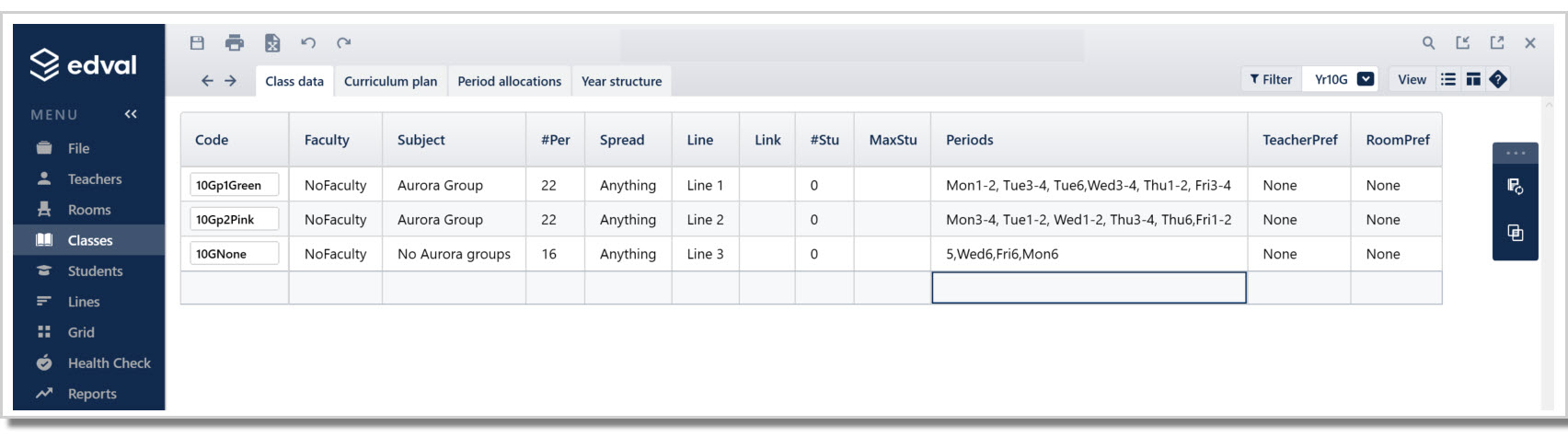 As the periods for the Year 10G classes have been hard coded to the periods when they need to occur, they will automatically appear on the timetable in the appropriate locations. This can be seen in either the Year Timetable (F7) screen, or on the Mastergrid (F11).