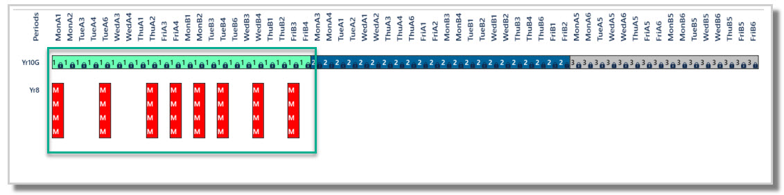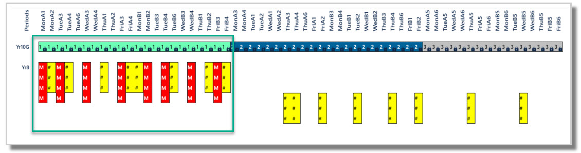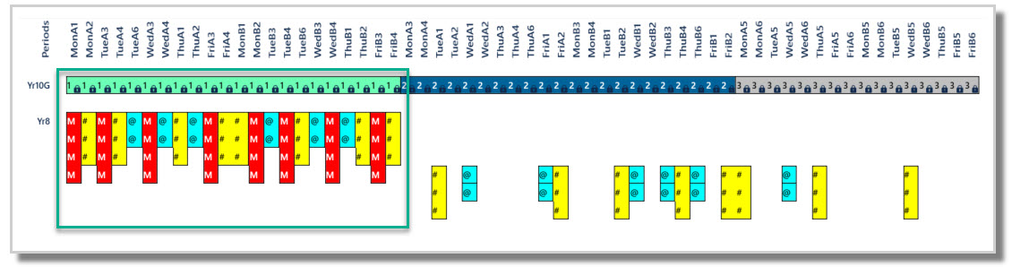 And once Science is added to the Master grid (F11) both 8SCI1 and 8SCI2 will sit under the Green group along with the English group and Maths line: