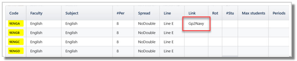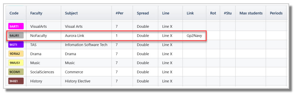 In the example below, English has 8 periods and Maths has 7 periods and both have been linked to the Aurora Navy group, like so: