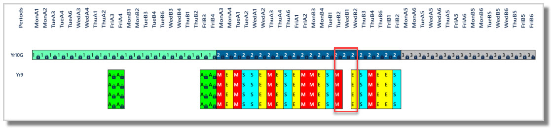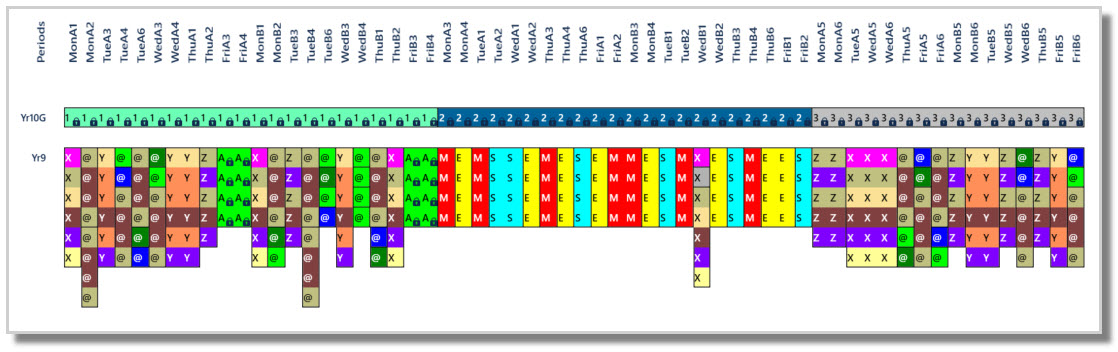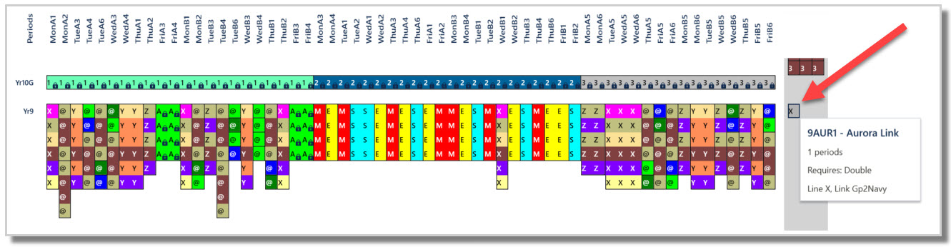 After adding the rest of the classes in year 9, Tes Timetable has put line X in the empty Aurora spot: