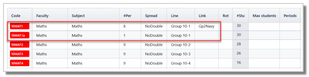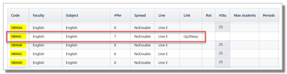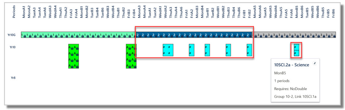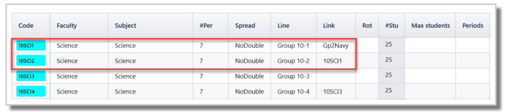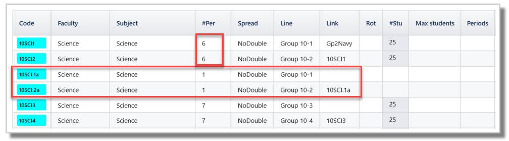 In the example below, Science has been allocated 7 periods which is 1 more than the required 6 periods for Aurora, with Science linked in pairs, where 10SCI1 is linked to 10SCI2 and 10SCI3 is linked to 10SCI4: