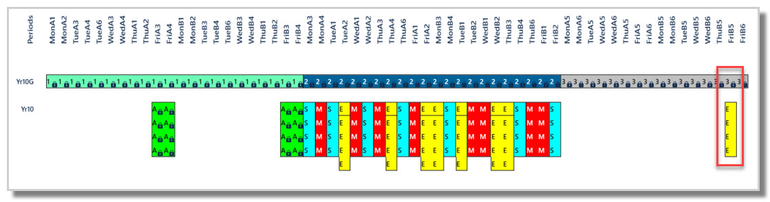 The dummy class should now be added to the Master grid (F11) and when done so E10 will link only 7 periods of the English line with the extra period allowed to float any where else on the grid: