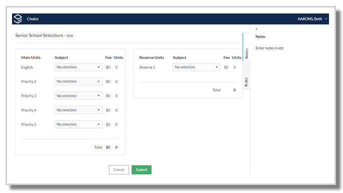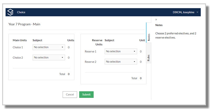 - A Year 7 form showing two Main Units drop downs, and two Reserve Units drop downs.