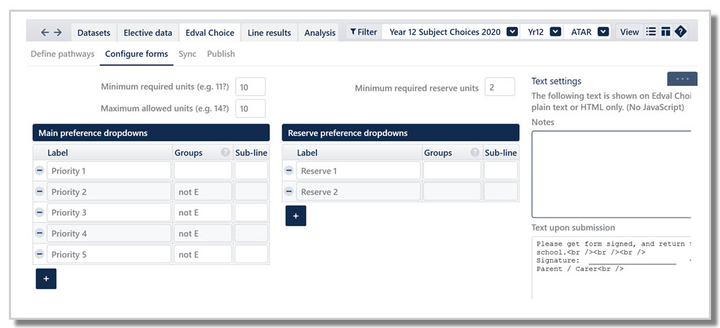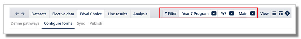 Navigate to Lines > Edval Choice > Configure forms and from the Filter section, select the relevant form and year level (and pathway if using pathways) from the drop downs.