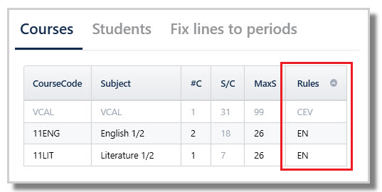 Groups: Schools may want certain courses only to appear in a dropdown for student selection. Courses can be assigned a 'Group' in the Elective data screen by associating them with a letter of the alphabet under the Elective data > Courses > Rules field, then entering the letter into the Configure forms > Groups field.As multiple letters can be assigned to courses, sometimes it is necessary to use the text 'NOT' to exclude courses from appearing for selection.In the example below, a rule exists that all Yr 12 students must submit 2 units of E group subjects. On the first pathway form, we want the E group courses 11ENG and 11LIT to appear in the first dropdown, but we do not want the course 'VCAL' to appear. We enter E NOT C.On the second pathway form we want the VCAL course only to appear. We could enter just C, or V, but if there are other courses in the dataset associated with the letter C or V, those courses will also display. We can also enter E NOT N.There are many many options when setting up Rules and Groups and customising forms, so it is likely that much trial and tweaking will occur to get the forms as desired.