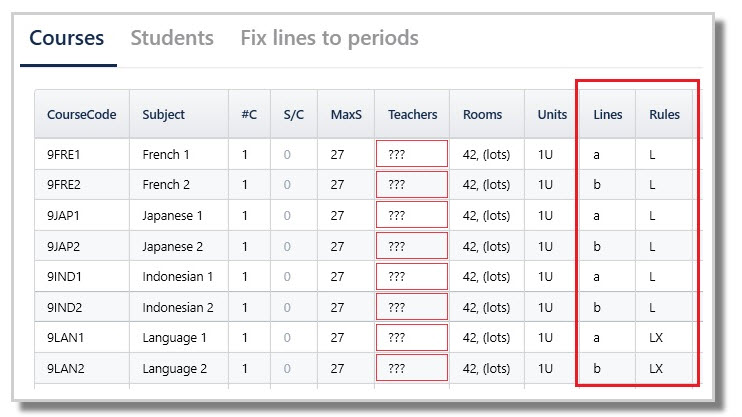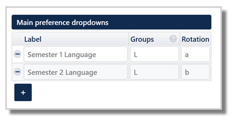 Rotation / Sub-line: This field toggles between Rotation and Sub-line. Where the parameters of the elective data has been defined as being 'rotated' then this is 'Rotation', where it is not rotated, it becomes 'Sub-line'. This field restricts choice to rotation or sub-line subjects, and allows better curriculum rule checking. This entry is a secondary filter to the Group filter. If the group was ‘P’ and the rotation coded as ‘b’, then only courses which are in group P and ALSO in Rotation 2 will be shown in this drop down.The ‘a’ and ‘b’ rotation/sub-line groups should also be entered into the Elective data > Courses table >Lines column. Courses with no such letter can be either rotation/sub-line. A course with ‘a’ is a rotation 1 course, and ‘b’ is rotation 2 and so on. An entry of ‘d’ would be the 4th rotation – or more accurately time group, which would likely be a term 4 elective course. A course entry of Line = “2a,3a” means that the course can run in either line 2 or line 3 (or both if two or more classes), but only rotation ‘a’ which is first rotation.Courses which run for the full year need no entry in the rotation field.Example: Students in Year 9 must choose a language for Rotation 1 and Rotation 2. The language courses must be run in particular rotations, and we will set up the form so that students are forced to choose a language from each rotation.We have entered 'a' in the Lines column for the courses that will run in Rotation 1, and 'b' for courses that will run in Rotation 2.