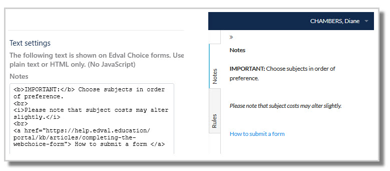 The image on the left below shows the submission text entered into the etz file, using some html. The image on the right shows how it appears for students when they have submitted their preferences online and have the option to print or email the form: