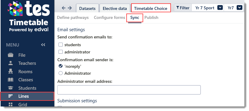 Refer to Elective data documentation for detailed guides on elective data set up. - Sync form: Lines > Timetable Choice > Sync