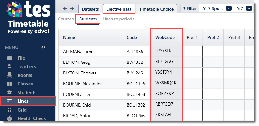 - Lines > Elective data > Students