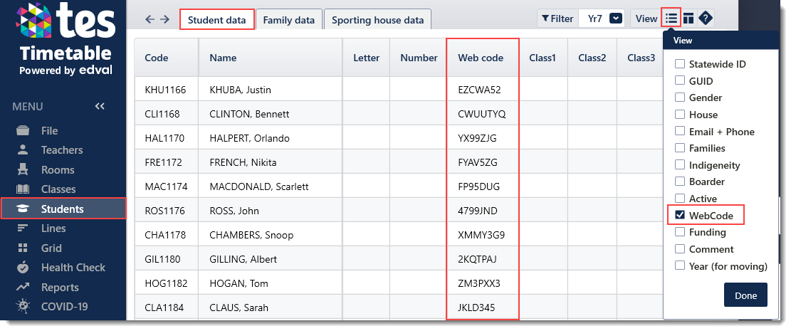 - Students > Student data. Ensure that Webcode is ticked in the View > Fields to show menu.
