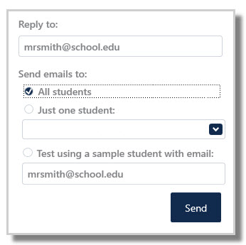 - This feature may be tested prior to sending to students to check formatting. Select Test using a sample student with email and enter the email address the test email should be sent to