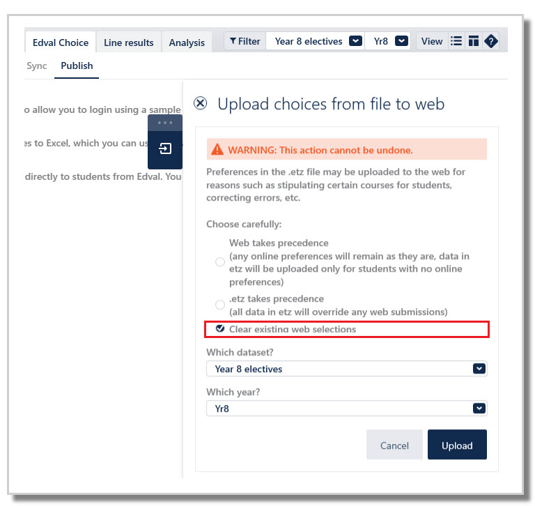 Note that any preferences in the .etz file will also be cleared from the Elective data > Courses > Students screen. Be sure to save a back up of the file prior to performing this action if you wish to refer to any previously downloaded preference information.