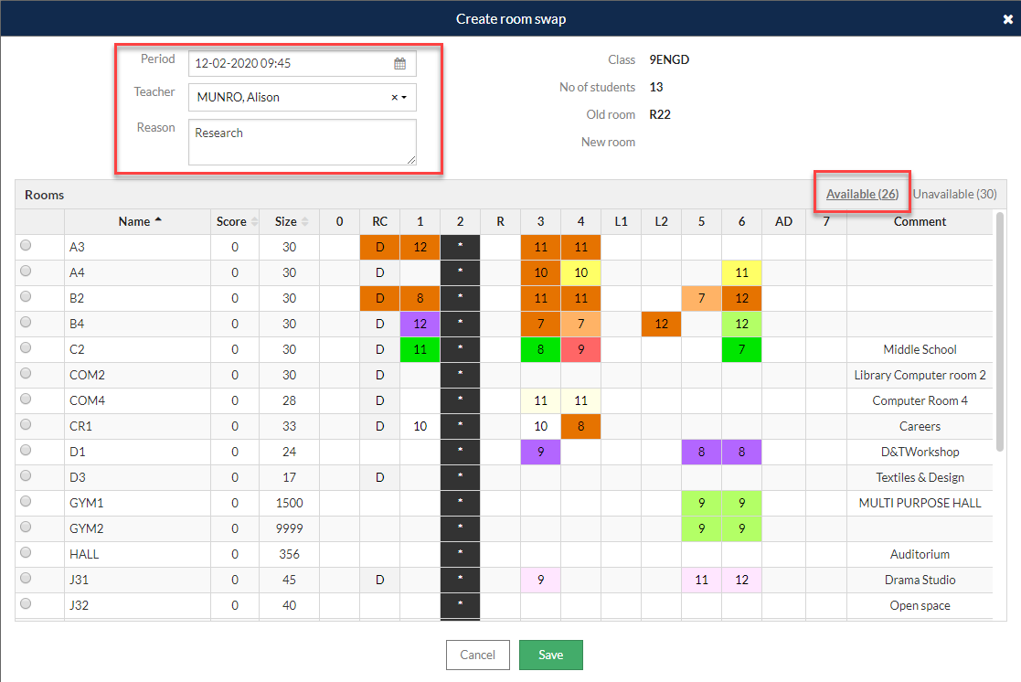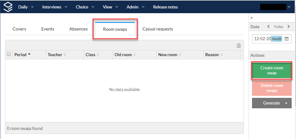 - In the 'Create room swap' window that opens, select the required date, period and staff member and enter a reason if applicable. This will display a list of available rooms for the selected period. If the teacher does not have a class in that period, no data will display.
