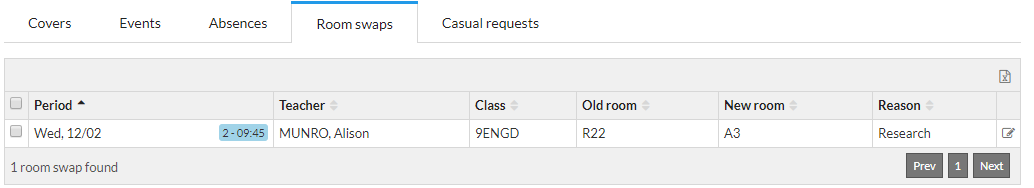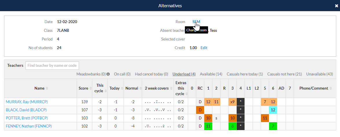 Room swaps can now be done via the alternatives window when assigning a teacher to a cover. This is useful if the covering teacher is not qualified to teach in the assigned room.