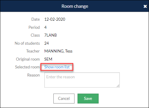 - This will open the Room change window. Enter a reason if required. Select 'Show room list.
