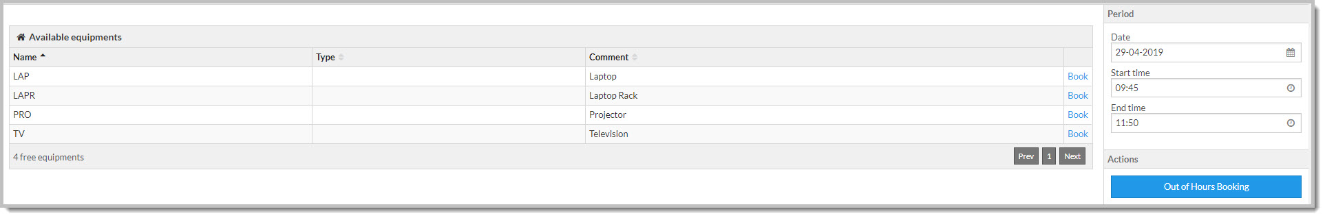 On the right hand side, you will see a Period box. Select the time you would like to make an equipment booking and, provided the equipment is available during that time, you will see it in the list as shown below: