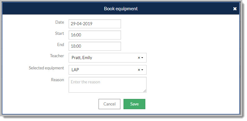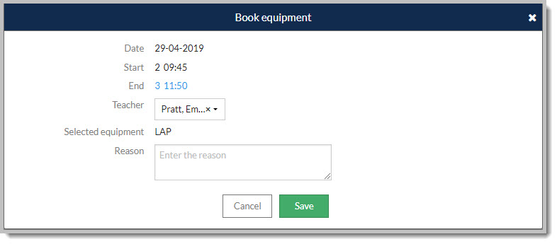 After you have chosen the date and time, select the teacher and the equipment required, add a note if needed, then press save.