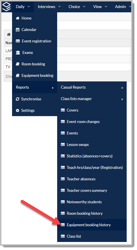 To access this report, go to the Daily drop down menu, then the Reports menu, and select the Equipment Booking History Report as shown below: