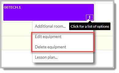 After you have created an equipment booking, you may either Edit the booking or Delete it by going to the options menu on the class the booking was made on: