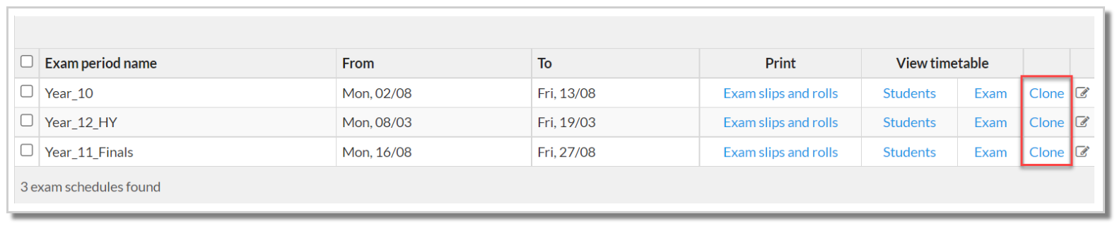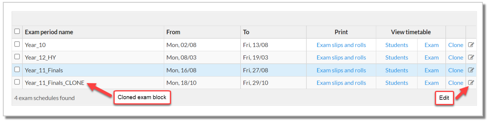 To clone an existing exam block, navigate to Daily > Exams and select the 'Clone' link at the end of the row for the exam block you wish to clone. You can only clone one exam block at a time.