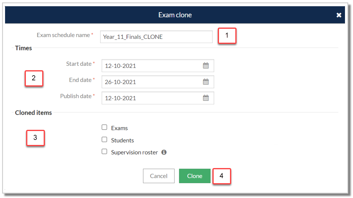 - The name of the exam schedule needs to be unique. A default name will appear, being the same as the original name with _CLONE appended. Change the name as required, ensuring it remains unique.