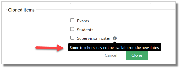 d) The supervision roster may be selected but note that if any of the teachers allocated to the supervision roster in the original exam block become unavailable on the new dates, they will be removed from the roster. There is no point in selecting the supervision roster to be cloned if you have not selected exams and students as well, as there will be no roster to clone. - When you are ready to clone, select the 'Clone' button. This will add the new exam block to the table where it can be edited as usual.