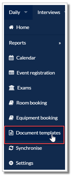 To email an exam schedule to students using the default template or a cloned template, go to Daily > Exams.