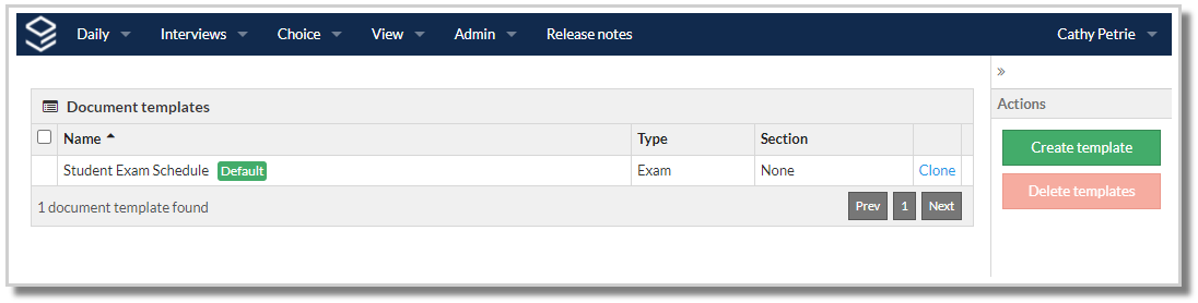 To create a new template from scratch, rather than cloning an existing one, select the 'Create template' button in the Action panel on the right hand side of the Document Template screen. This will open a blank template form. Give the template an appropriate name. The template type is 'Exam'.