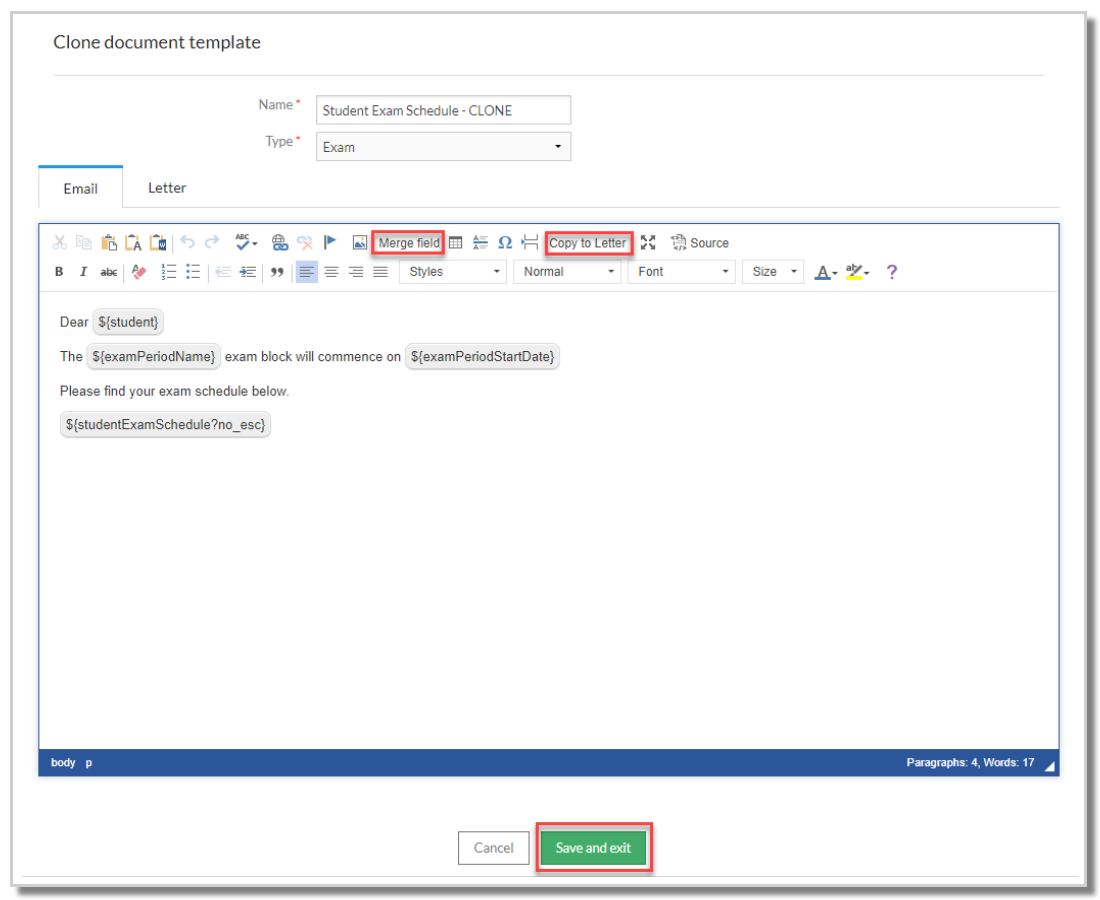 Once the template has been finalised, if the same template is going to be used for letters as well as emails, select the 'Copy to letter' button.