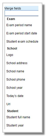 Selecting the 'Merge field' button will display the available merge fields as shown below. Click on the required merge field to add it to the template.