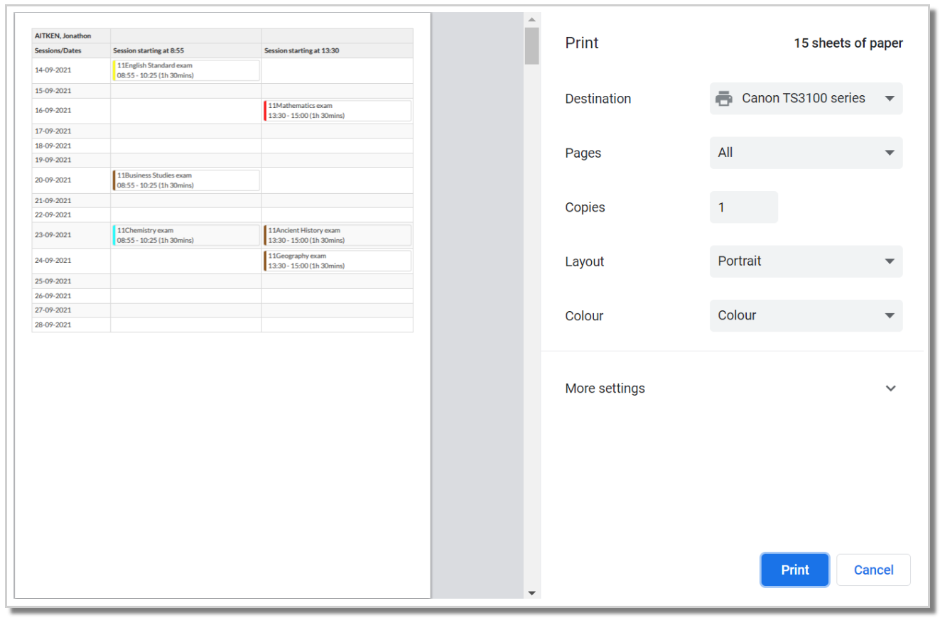 NOTE: If you wish to print the full schedule or the individual student schedules in colour, as per the screen, you can do this by selecting the schedules to be printed and using CRTL-P to bring up the print dialog.