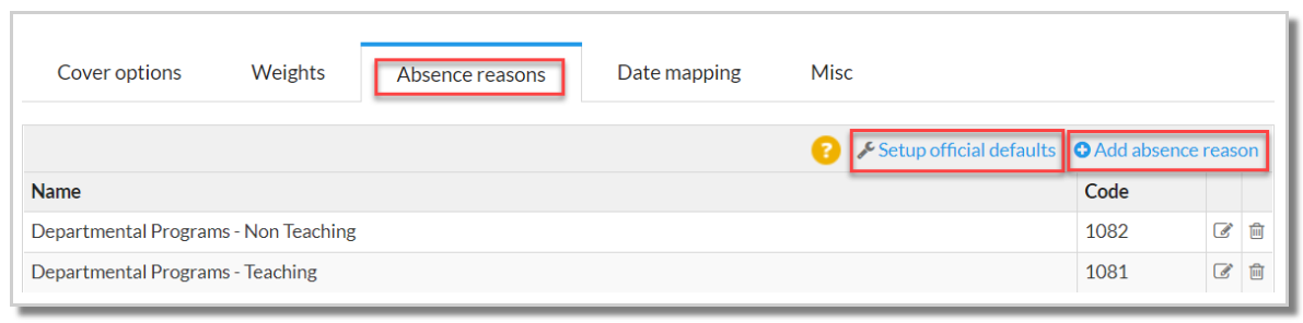 Navigate to Daily > Settings > Absence reasons. This tab allows you to create new absence reasons, modify or delete existing reasons or merge official codes by the region selected in the timetable file. Once added or imported, reasons will roll over from one year to the next; however, there may be a need to add new reasons or delete or edit existing reasons during the year.