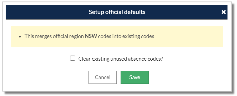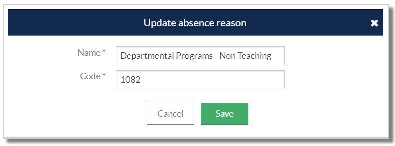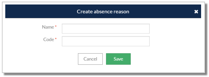 Enter the name and code of the required absence reason and select 'Save' or use 'Cancel' to close the window without saving.