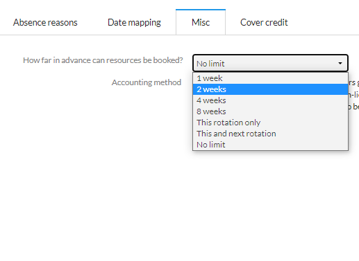 The options are 1 week, 2 weeks, 4 weeks, 8 weeks, This rotation only, This and next rotation or No limit.